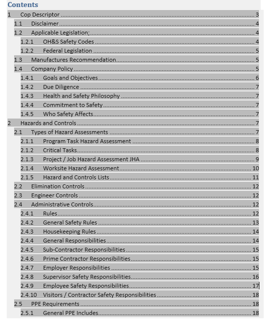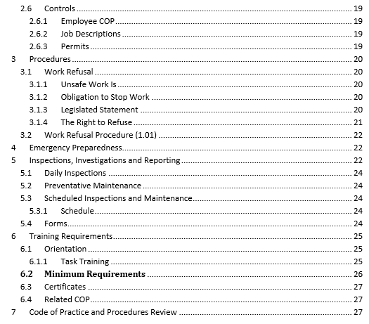 A Code of practise (COP) is a chapter in our Safety Program where we categorize similar tasks.